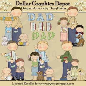 This one-of-a-kind collection is only available at Digital Craft Supplies. This set includes five dads, three little girls, three little boys, three babies, one kitten, two puppy dogs, dog bowl, dog food, baby duck toy, baby rattles, baby bottles, ice cream cones, and three "Dad" word art graphics. This exclusive set contains 8 graphics.