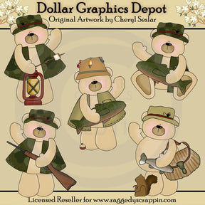 This collection includes five daddy bears, with camouflage and khaki vests, and fishing hats with lures, fish, a fish bag, a musket, a lantern, a toasted marshmallow on a stick, and a little squirrel. This set contains 5 graphics.