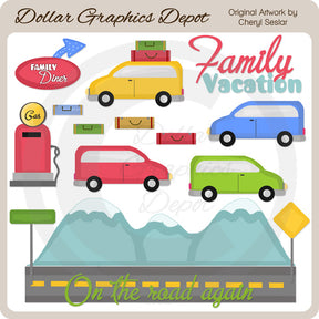 This large collection includes four mini vans (one with suitcases on top), four suitcases, a road, two traffic signs, snow capped mountains, a gas pump, a "Family Diner" sign, and two word art graphics - "Family Vacation" and "On The Road Again." This set contains 16 graphics.