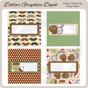 This collection includes four Father's Day chocolate bar wrappers - one with different color mustaches, one with a pocket watch and a coffee mug with a mustache and "Papa" word art, one with a fishing bobber and a coffee mug with a fish and "Dad" word art, and one with coffee mugs, mustaches, pocket watches, and fishing bobbers. This set contains four regular size (1.55 oz.) chocolate bar wrappers.