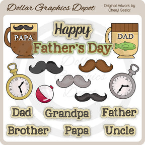 This large collection includes a "Dad" mug with a fish, a "Papa" mug with a mustache, stopwatches, mustaches, a fishing bobber, and eight Father's Day word art graphics - "Happy," "Father's Day," "Dad," "Grandpa," "Father," "Brother," "Papa," and "Uncle." This set contains 17 graphics.