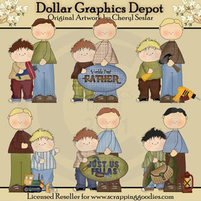 This collection includes six handsome fathers, and six little sons, each wearing slacks and long sleeve shirts, a toy airplane, a bulldozer, screwdrivers, a hammer, a drill, fish, a fishing bag, a lantern, and two Father's Day signs that read: "World's Best Father" and "Just Us Fellas." This set contains 6 graphics.