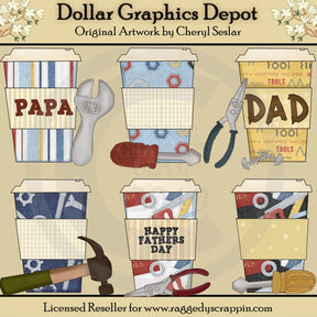 This one-of-a-kind collection is only available at Digital Craft Supplies. This set includes six mocha cups in blue, yellow, white, red, and black, and several tools, including a hammer, pliers, wrench, screws and screwdrivers. Three of the mocha cups have Father's Day word art graphics, and the other three are blank, for you to add your own personalization. This exclusive set contains 6 graphics.