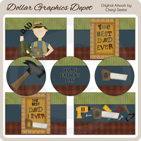 This collection includes four gallon paint can covers, plus one back cover (not shown), and three coordinating lids. The front covers include one with a dad wearing a fishing hat and vest, fish, a tackle box, fishing bobbers, and "Dad" word art, one with "The Best Dad Ever" word art, one with "The Best Dad I Ever Saw" word and picture art, and one with lots of tools. The back cover is blank with a green, blue, and brown background. The three lids include one with a hammer, one with "Happy Father's Day" word art, and one with a saw. The This set contains 8 printables (one not shown in preview).