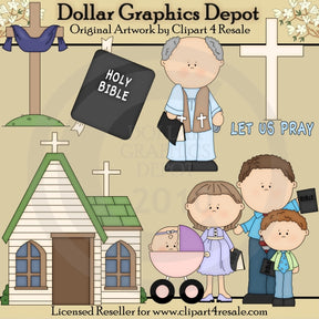 This one-of-a-kind collection is only available at Digital Craft Supplies. This set includes a pretty church with crosses, a Holy Bible, a cross on a grassy hill, with a cloth draped over it, a pastor holding a Bible, one "Let Us Pray" word art graphic, and a Christian family going to church - a father, mother, and son, each holding a Bible, and a little baby girl in a baby carriage. This exclusive set contains 6 graphics.