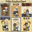 This collection includes six 5x7 "Super Dad" card fronts, with handsome daddies, wearing slacks, dress shirts, and some with ties, pretty daughters, wearing rolled up blue jeans, gingham and polka dot blouses, and matching hair bows, cute little sons, wearing slacks, overalls, and long sleeve shirts, BBQ grills, bags of charcoal, grilling tongs, screwdrivers, a hammer, a drill, fish, a fish bag, and a lantern. Five cards include the following word art - "Dad" (3), "Daddy," and "World's Best Father." Patterns include: polka dots, checkers, and gingham. Colors include: red, green, yellow, blue, brown, beige, tan, black, and white. This set contains 6 cards.