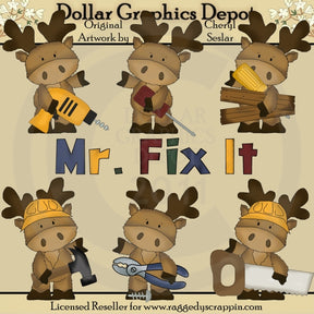This collection includes six adorable moose with hard hats, screwdrivers, a drill, planks of wood, a hammer, pliers, a screw, a saw, and one "Mr. Fix It" word art graphic. This set contains 7 graphics.