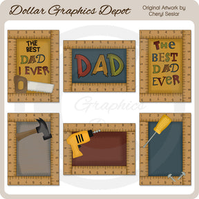 This collection includes six 5x7 card fronts with a power drill, a hammer, a screwdriver, screws, a saw, "The Best Dad Ever" word art, and measuring tape borders. This set contains 6 cards.