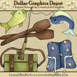 This collection includes a tackle box, a fishing pole, wooden oars, a life jacket, and two colorful fish. This set contains 6 graphics.