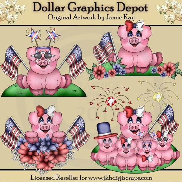 This collection includes a cute little boy pig, sitting on a patch of grass, with star shaped sunglasses, a headband with wobbly stars, and two American flags, a cute little girl pig, sitting on a patch of grass, with a pretty hair bow, an American flag, and beautiful red and blue flowers, a cute little girl pig, with a pretty hair bow, two American flags, and beautiful red, white, and blue flowers, and a piggy family, sitting on a patch of grass with bursting fireworks behind them - a mommy pig with a pretty hair bow and an American flag, a little boy pig with a red, white, and blue top hat, a little girl pig with a pretty hair bow, a little boy pig with a bow tie and a headband with wobbly stars, and a little girl pig with a pretty hair bow and star shaped sunglasses. This set contains 4 graphics.