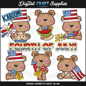 This collection includes six adorable fuzzy bears, patriotic top hats, red, white and blue firecrackers, rockets, and shooting stars, a fresh baked cherry pie, a slice of watermelon, an American flag, and two word art graphics - "Kaboom" and "Fourth Of July!" This set contains 8 graphics.