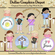 This collection includes five little girls, dressed in pretty T-shirts and plaid pants, in aqua, pink, blue, purple, peach, and green, three Christian signs that read "Smile, Jesus Loves You," "Jesus Saves," and "I Love Jesus," a fishing pole with a Christian fish and word art that reads "Fishers Of Men," Holy Bibles, and pretty wooden crosses. This set contains 8 graphics.