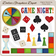 This large collection includes dice, a domino, a game board corner, a game spinner, a timer, game pieces, a club, a spade, a diamond, a heart, and one "Game Night" word art graphic. This set contains 17 graphics.