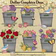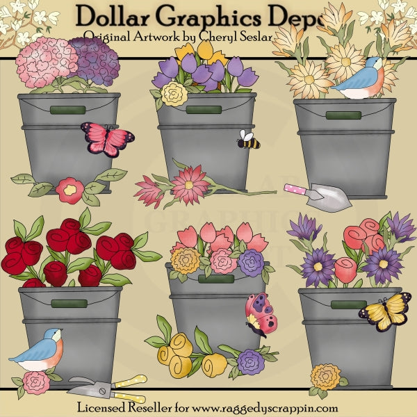 This collection includes six metal buckets filled with colorful spring flowers, pretty butterflies, robins, a little bumble bee, a hand shovel, and pruning shears. This set contains 6 graphics.