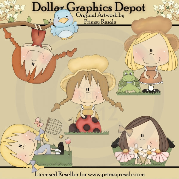 This collection includes five little garden girls - one hanging upside down from a tree branch, with a little blue bird, one standing in the grass with a cute little turtle, one standing in the grass with a ladybug, one lying in the grass with pretty flowers, and one lying in the grass with a butterfly net and little butterflies. This set contains 5 graphics.