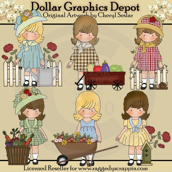 This one-of-a-kind collection is only available at Digital Craft Supplies. This set includes six little garden girls, wearing pretty gingham and polka dot dresses, scarves, and floral hats in blue, brown, red, white, green, and yellow, white picket fences, red roses, ivy leaves, a metal watering can, a pretty birdhouse, a red wagon filled with veggies, a bumble bee, a cute little snail, a wheelbarrow filled with colorful flowers, and a basket full of veggies. This exclusive set contains 6 graphics.