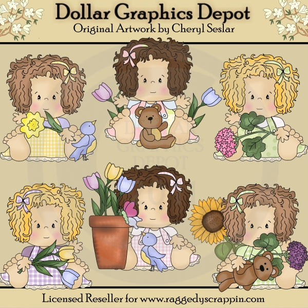 This collection includes six adorable little girls, wearing pretty gingham, patchwork, and polka dot jumper dresses, and matching hair bows, little stuffed teddy bears, a clay flower pot, filled with colorful tulips, little blue birds, a beautiful butterfly, and pretty flowers - a daffodil, tulips, geraniums, and a sunflower. This set contains 6 graphics.