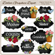 This collection includes eleven "My Gals" chalkboard frames, with colorful flowers, long stem roses, clay pots filled with tulips, blue birds, and the following word art - "Aunt," "Best Friend," "Sis," "Mother," "Sister," "Family," "Cousin," "Grandma," and "My Family." This set contains 11 graphics.
