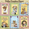 This collection includes six 5" x 7" get well soon card fronts, with cute little teddy bears, sweet nurses, nurse scrubs, nurse hats, patchwork dresses, pretty hair bows, a stethoscope, first aid kits, a string of hearts, Band-Aids, shots, cough syrup, a prescription bottle, a jar of cotton, and little red hearts. Four cards include the following word art: "Nurse," "Get Well Soon," "Hope You Are Feeling Better," and "Best Nurse." Patterns include: polka dots, gingham, and plaid. Colors include: red, green, blue, yellow, purple, white, black, gray, tan, and brown. This set contains 6 cards.