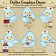 This collection includes six sweet little blue birds, nurse hats, a can of soup, a Band-Aid, stethoscope, a prescription bottle, cough syrup, a first aid kit, a shot, and a jar of cotton. This set contains 6 graphics.
