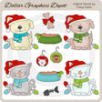 This collection includes adorable Christmas puppy dogs and kitty cats, with winter hats, scarves, and Christmas lights, dog and cat food bowls with holly berry leaves, dog and cat Christmas ornaments, a dog bone, and fish bones. This set contains 10 graphics.