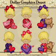 This collection includes six adorable little Valentine babies, wearing footsie pajamas and pretty hair bows, a Valentine heart with an arrow through it, a stitched Valentine heart with scalloped edges, pretty flowers, a Valentine card in an envelope, a cute little kitty cat, a cute little puppy dog, and Valentine hearts with word art that reads "Be Mine," "Cutie Pie," "True Love," and "Love You." Colors include: red, pink, purple, yellow, green, tan, and brown. This set contains 6 graphics.