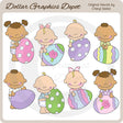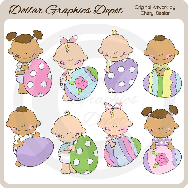 This collection includes adorable baby boys and girls with diapers, t-shirts, pretty hair bows, and painted Easter eggs. This set contains 8 graphics.