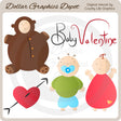 This collection includes a cute little baby boy with a heart-shaped pacifier, a pretty little baby girl, a little baby dressed in a teddy bear outfit, a heart with an arrow, and one "Baby Valentine" word art graphic. This set contains 5 graphics.