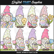 This collection includes eight little Easter gnomes with polka dot, floral, and gingham outfits and coordinating hats, painted Easter eggs, a colorful easter basket, pretty spring flowers, grass, and a little Easter chick. This set contains 8 graphics.