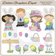 This large collection includes sweet little Easter boys and girls, with cute Easter outfits, an Easter hat, and bunny ears, pretty spring tulips, colored Easter eggs, Easter Baskets, a sign in a patch of grass, and a little bunny in a patch of grass. This set contains 17 graphics.