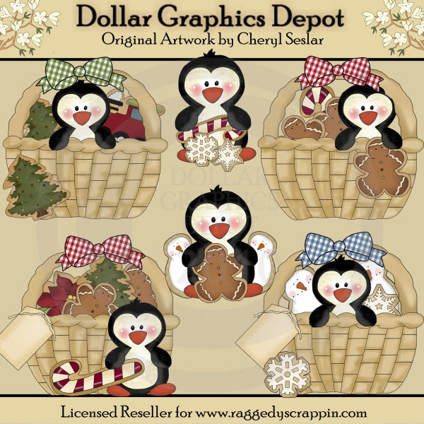 This collection includes six adorable penguins, four woven Christmas baskets, with pretty gingham bows, gift tags, and lots of decorated Christmas cookies in the shapes of Christmas trees, candy canes, snowflakes, gingerbread men, a choo choo train, snowmen, and a pretty poinsettia. Colors include: red, green, blue, white, yellow, tan, brown, orange, and black. This set contains 6 graphics.