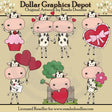 This collection includes seven cute little cows, a patch of grass, picket fence, a tree, a red Valentine heart, a box of Valentine chocolates with a pretty pink bow, a Valentine card, heart shaped balloons, a frosted cupcake with cherry on top, mini Valentine hearts, and a pretty pink flower. This set contains 6 graphics.