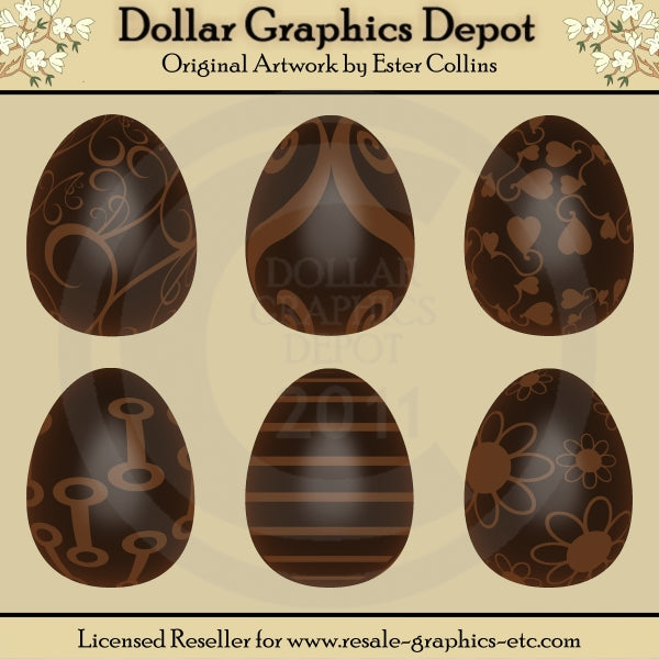 This collection includes six beautifully decorated chocolate eggs, with pretty designs, scrolls, stripes, hearts, and flowers. This set contains 6 graphics.