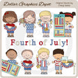 This collection includes eight adorable Fourth of July kids, wearing red, white, and blue outfits, patriotic bunting, a sparkler, rockets, boxes of "Super Boom Deluxe" fireworks, a table setting with patriotic bunting, a pitcher of lemonade, and a cheeseburger, and one "Fourth Of July" word art graphic. This set contains 9 graphics.