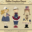 This collection includes a little girl wearing a pretty dress and sailor hat with a star, flying an American flag, a little boy wearing blue jean overalls, a red T-shirt, and sailor hat, holding red, white, and blue bunting, and a little girl wearing a pretty dress with patches and a patriotic hat, holding a cute little teddy bear. This set contains 3 graphics.