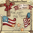 This collection includes a beautiful wooden cross with a pretty star scarf, a patriotic sign that reads: "In God We Trust," a burst of golden stars, two American flags, and one "Rise Again Olde Glory" word art graphic. This set contains 6 graphics.