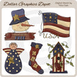 This collection includes an Americana birdhouse, with gold stars, a red heart, and pretty vine leaves, an Americana stocking with a gold star and "USA" patches, a patriotic snowman with a wooden sign that reads: "Land Of The Free," an Americana angel, and an American flag with "USA" word art. This set contains 5 graphics.