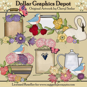 This collection includes an old fashioned pail, a wash basin, a pretty swan, a painted bowl, a crock, a percolator, blue birds, butterflies, and lots of pretty flowers. This set contains 6 graphics.