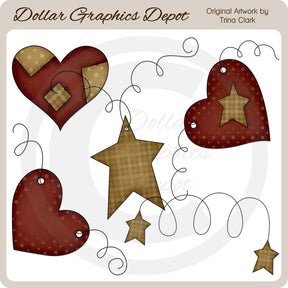 This collection includes country patchwork hearts and stars and twisty wires. This set contains 5 graphics.
