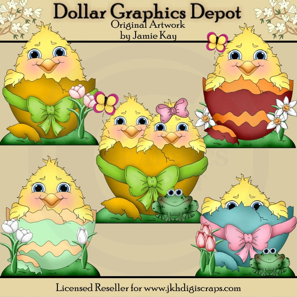 This collection includes six little Easter chicks, peeking out of colored Easter egg shells, green grass, pretty tulips and daffodils, spotted frogs, and little butterflies. This set contains 5 graphics.
