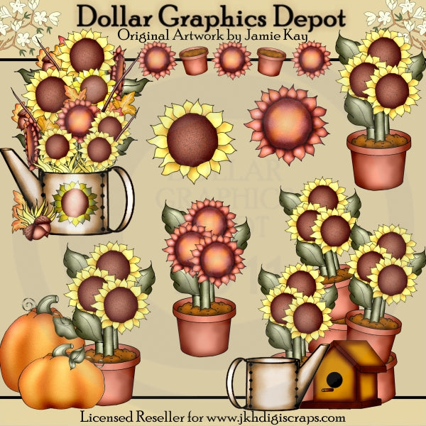 This collection includes lots of beautiful sunflower arrangements, clay flower pots, pretty watering cans, a wooden birdhouse, fall pumpkins, autumn leaves, acorns, and one sunflower and flowerpot border. This set contains 8 graphics.