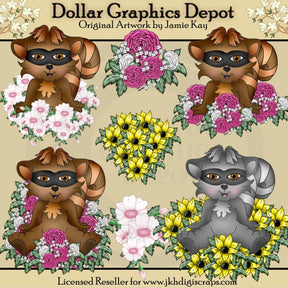 This collection includes four adorable raccoons and lots of colorful flowers. This set contains 7 graphics.