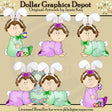 This collection includes three cute little toddler boys, and three cute little toddler girls, with footsie pajamas, hair bows, bow ties, adorable bunny ears, fluffy bunny tails, and lots painted Easter eggs. This set contains 5 graphics.