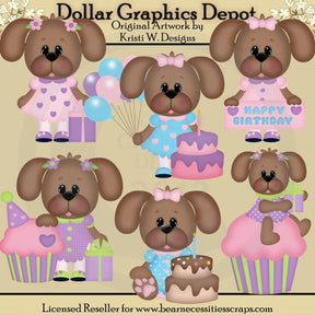 This one-of-a-kind collection is only available at Digital Craft Supplies. This set includes six adorable, birthday girl puppy dogs, with pretty patterned dresses, pink hair bows, floral hair clips, frosted cupcakes, wrapped birthday presents with pretty bows, a party hat, birthday balloons, layered birthday cakes with candles, and one party sign that reads "Happy Birthday." This exclusive set contains 6 graphics.