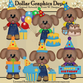 This one-of-a-kind collection is only available at Digital Craft Supplies. This set includes six adorable, birthday boy puppy dogs, with blue jean overalls, colorful T-shirts, party hats, a frosted cupcake, wrapped birthday presents with pretty bows, birthday balloons, layered birthday cakes with candles, and one party sign that reads "Happy Birthday."This exclusive set contains 6 graphics.