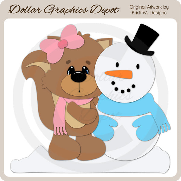 This one-of-a-kind collection is only available at Digital Craft Supplies. This exclusive set includes cutting files that can be used to create this adorable winter craft project (shown “finished” in preview) – a cute little winter squirrel with a pretty pink hair bow and winter scarf, a winter snowman with top hat, button eyes and mouth, carrot nose, blue winer scarf and mittens, and lots of snow.