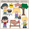 This collection includes adorable little boys and girls, a barbecue grill with hot dogs and tongs, a bag of charcoal, a slice of watermelon, a chicken drumstick, a glass of lemonade, a picnic table with a checkered tablecloth, picnic basket, a cheeseburger, a bottle of ketchup, a bottle of mustard, a tree, the sun with sunglasses, and one "BBQ" word art graphic. This set contains 8 graphics.