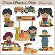 This collection includes adorable little boys and girls, a basket of apples, fall pumpkins, haystacks, a wooden "Hayrides" sign, a tractor pulling hay, colorful autumn leaves, black crows, a sunflower, a "Cider and Doughnuts" stand, painted mugs, donuts, corn stalks, a wooden picnic table, and an autumn scarecrow. This set contains 7 graphics.