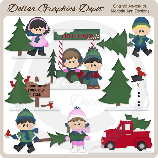 This collection includes adorable winter boys and girls, wearing winter clothing, hats, scarves, and ear muffs, lots of snow, pine trees, a snowman, red birds, axes, a wooden sign that reads: "Chop Down Your Own Tree," a red pickup truck, and a "Tree Farm" stand with a holly berry wreath. This set contains 7 graphics.