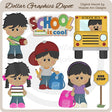 This collection includes adorable school girls and boys, school books, a red apple, a pencil, backpacks, a "Bus Stop" sign, a school bus and driver, and one "School Is Cool" word art graphic. This set contains 7 graphics.